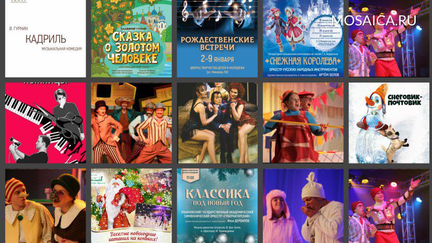 2 и 3 января в 12:00, 14:00 в концертном зале Дворца творчества детей и молодёжи литературно-музыкальная композиция по сказке Г.Х. Андерсена «Снежная королева». Программу представляют: Ульяновский государственный губернаторский оркестр русских народных инструментов, сказку читает актриса театра-студии «Enfant-terrible» Татьяна Леонова, песочное шоу – Анна Головская (Москва).