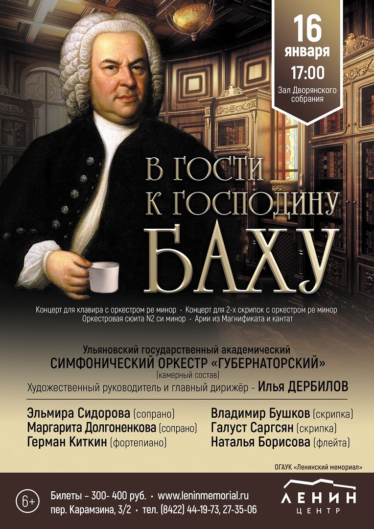 16 января в 17.00 в зале Дворянского собрания состоится концерт «В гости к господину Баху». На сцене выступит Ульяновский государственный академический симфонический оркестр «Губернаторский» и солисты: Эльмира Сидорова (сопрано); Маргарита Долгоненкова (сопрано);Герман Киткин (фортепиано); Владимир Бушков (скрипка); Галуст Саргсян (скрипка); Наталья Борисова (флейта).