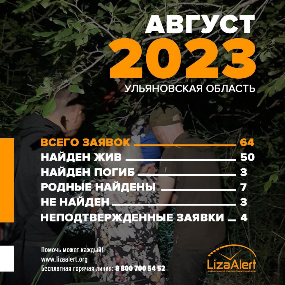 Поисковый отряд «Лиза Алерт» Ульяновской области опубликовал подробную статистику за август 2023 года. В прошлом месяце в отряд поступило 64 заявки на поиск 67 человек: 43 мужчин и 24 женщин.