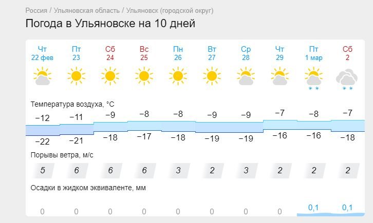 Синоптики gismeteo.ru в дальнейшие дни сильных заморозков не обещают. В Ульяновске будет солнечно, без сильного ветра и осадков. Днем будет до -9 градусов, в ночные часы – до -19 градусов.