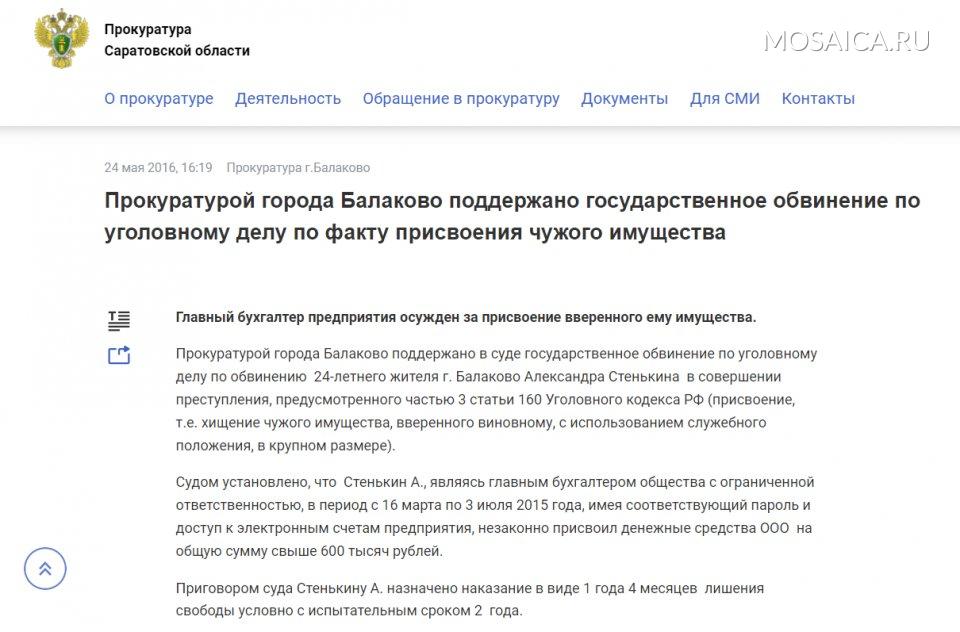 В 2016 году Стенькина первый раз судили. Он являясь главным бухгалтером общества с ограниченной ответственностью, в период с 16 марта по 3 июля 2015 года, имея соответствующий пароль и доступ к электронным счетам предприятия, незаконно присвоил свыше 600 тысяч рублей. Приговором суда Стенькину было назначено наказание в виде 1 года 4 месяцев лишения свободы условно с испытательным сроком 2 года. Тогда ему было 24 года.