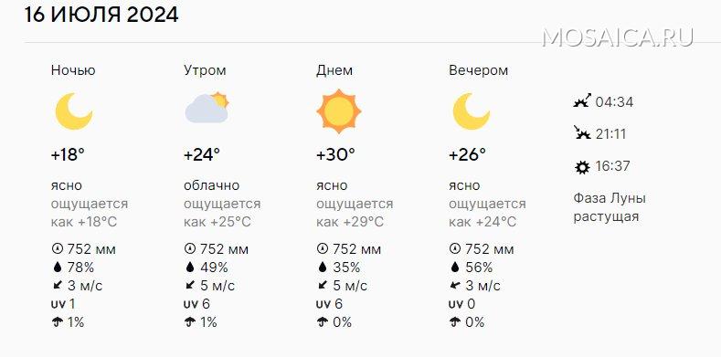 * 16 июля: Ночью ожидается +18°C, ясная погода. Утром +24°C, облачно, днем до +30°C, вечером +26°C, ясно. Ветер 3-5 м/с.