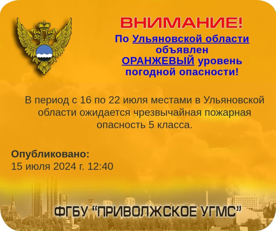 МЧС России по Ульяновской области предупреждает население о повышенной опасности. В период с 16 по 22 июля местами ожидается чрезвычайная пожарная опасность 5 класса.