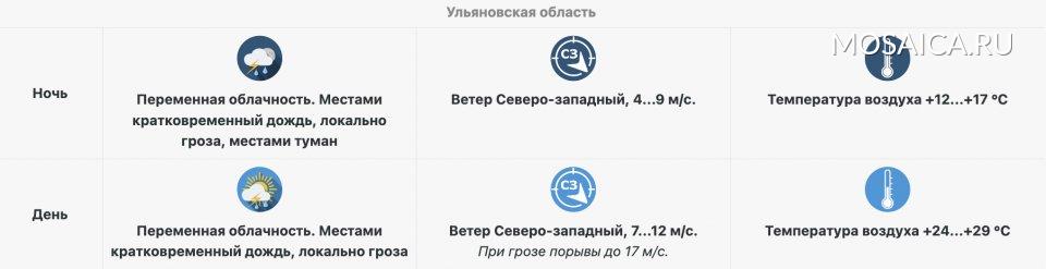 Синоптики Приволжского УГМС в свою очередь дают общий прогноз по области. Жителям региона обещают переменную облачность, в ночное время — местами кратковременный дождь с локальными грозами. Местами ожидается туман. Столбики термометров покажут +12…+17 градусов при северо-западном ветре 4-9 метров в секунду.