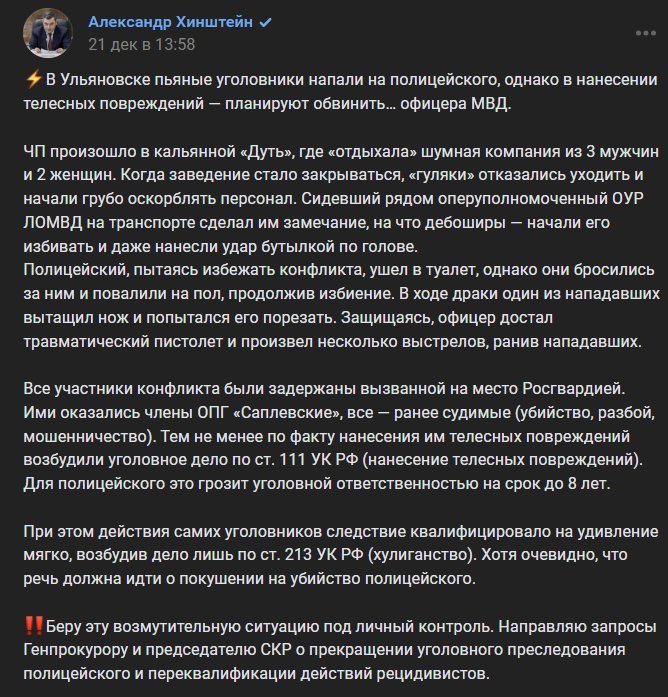 Ситуация вышла на федеральный уровень, когда о ней сообщил депутат Государственной Думы Федерального Собрания РФ Александр Хинштейн. По его словам, оппоненты полицейского и его спутников якобы члены ОПГ «Саплевские».