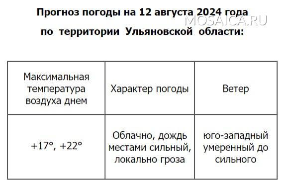В Ульяновске также будет сохраняться облачность. Днем ожидается дождь и гроза. Потоки ветра будут дуть юго-западные от умеренных до сильных. Максимум, до которого поднимутся столбики термометров, в этот день будет составлять +18...+20 градусов.