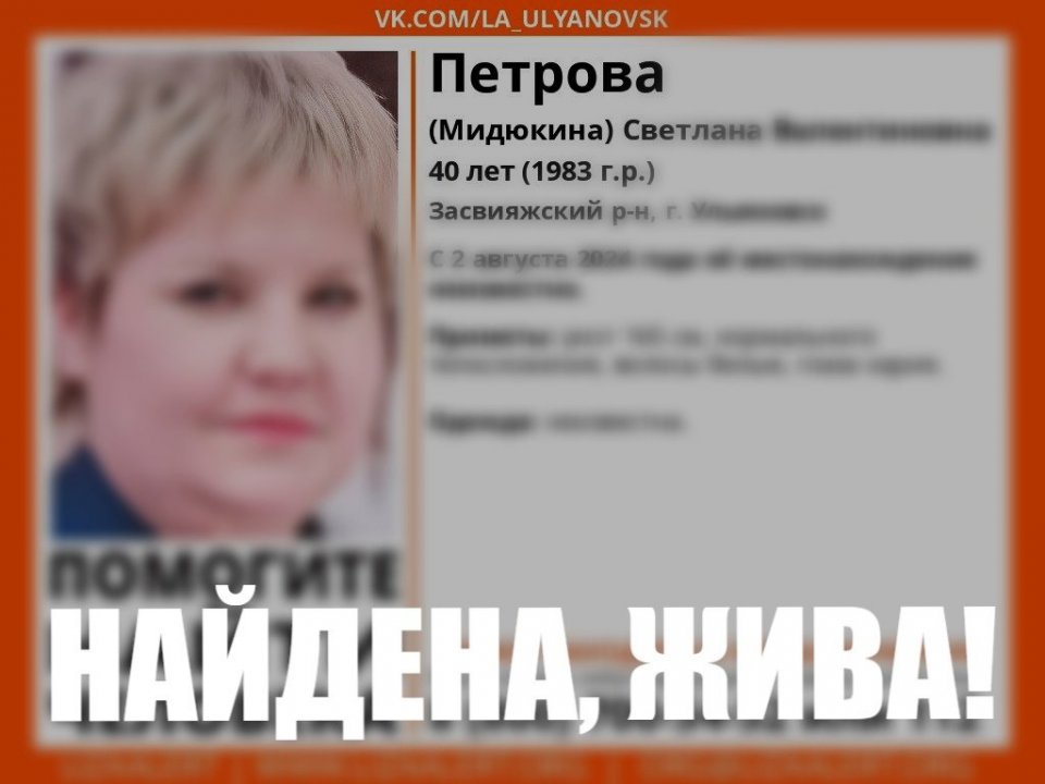 Представители отряда «Лиза Алерт» поблагодарили неравнодушных ульяновцев за содействие в поисках и попросили удалить репосты записей с ориентировками, так как содержащаяся в них информация теперь утратила свою актуальность.