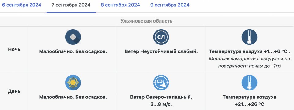 В последующие даты минусовых показателей уже не обещают. Ночью 8 сентября термометры покажут +5…+10 градусов, а ночью 9 сентября — уже +7…+12 градусов.
