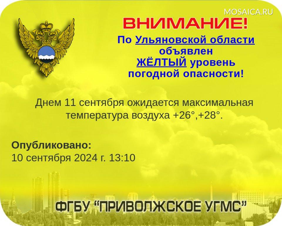По Ульяновской области объявили «желтый» уровень погодной опасности. Соответствующее предупреждение появилось на официальном сайте Приволжского УГМС. Как говорится в сообщении, днем в среду, 11 сентября, ожидается максимальная температура воздуха +26, +28 градусов.
