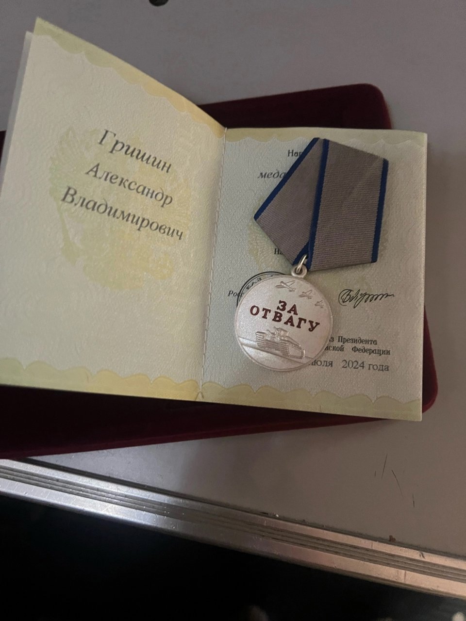 Гришин Александр проявил личное мужество и героизм, за что по указу Президента РФ Владимира Путина был награжден медалью "За отвагу".