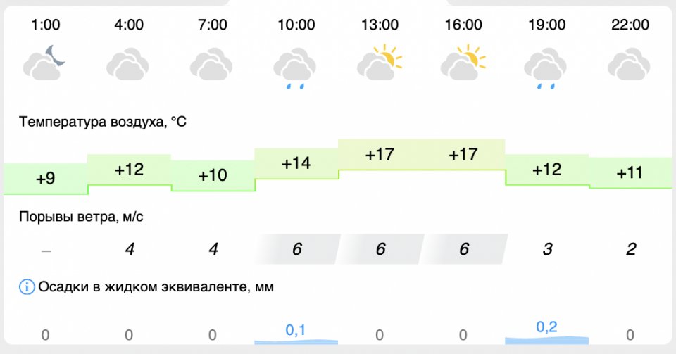 Синоптики Gismeteo в свою очередь дают подробный прогноз погоды по Ульяновску. И он слегка отличается. По данным сервиса, в областном центре сегодня будет пасмурно, а около 10 часов утра и около 7 часов вечера в городе пройдет небольшой дождь. Воздух прогреется максимум до +17 градусов.