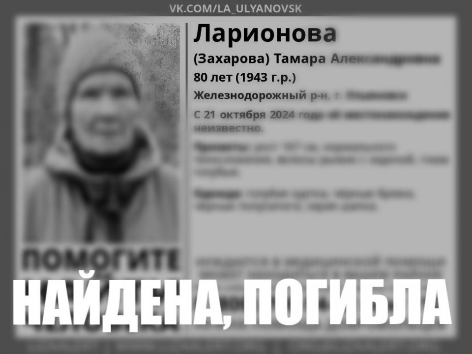 Напомним, женщина пропала 21 октября. Она ушла из дома и не вернулась. Близкие забили тревогу и подключили поисково-спасательный отряд. Публикуя ориентировку на поиск Тамары Ларионовой (Захаровой), добровольцы «Лиза Алерт» отмечали, что пропавшая женщина нуждается в медицинской помощи.