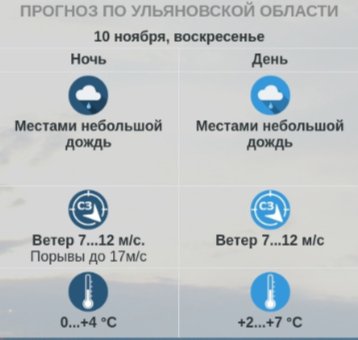 С вечера 9 ноября термометры опустятся до 0°...+4°. В воскресенье днем, 10 ноября, на территории 73 региона сохранится повышенный температурный режим. Столбики термометров достигнут показателей +2°...+7°. Ветер начнет ослабевать.
