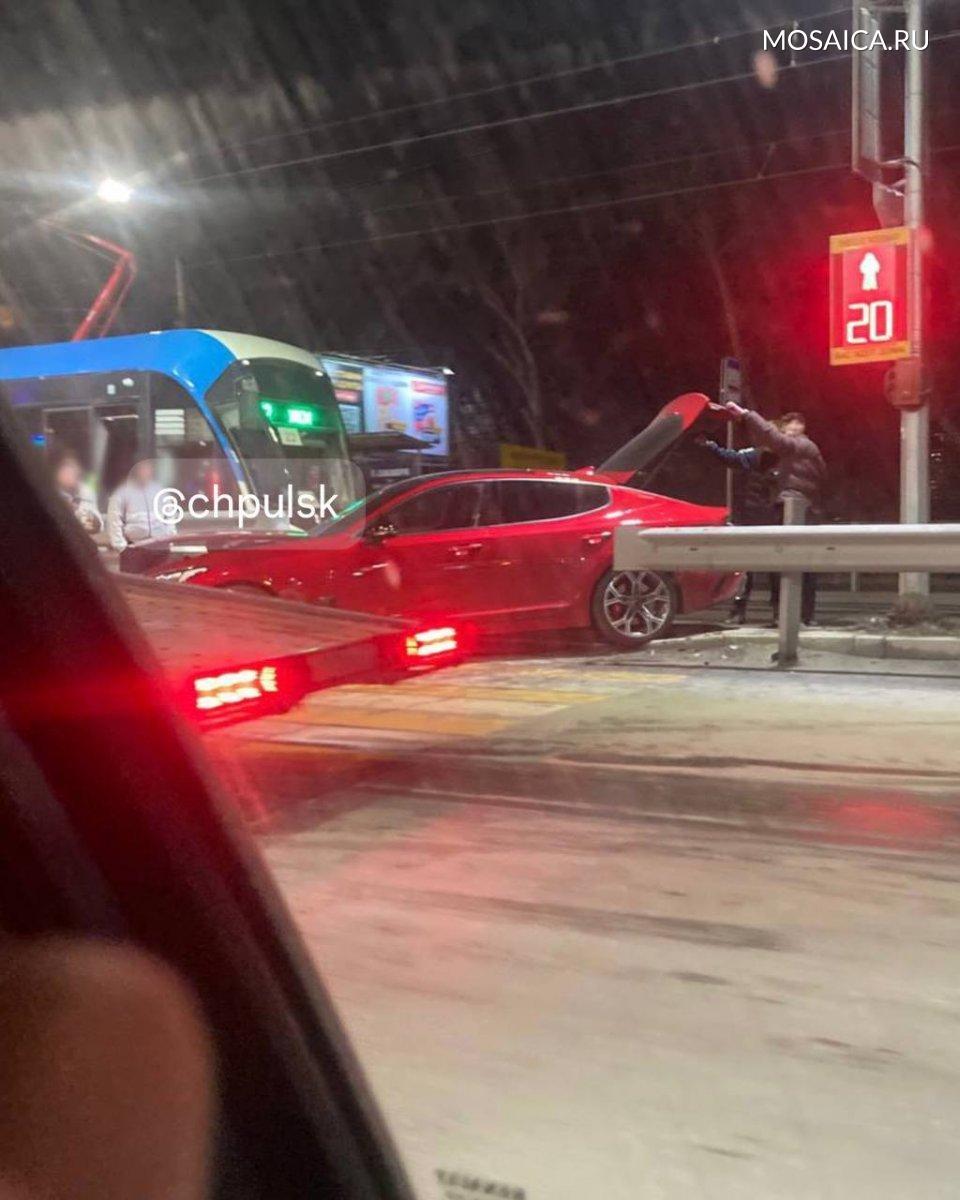 По словам очевидцев, водитель иномарки не справился с управлением, в итоге машина врезалась в отбойник у трамвайной остановки.