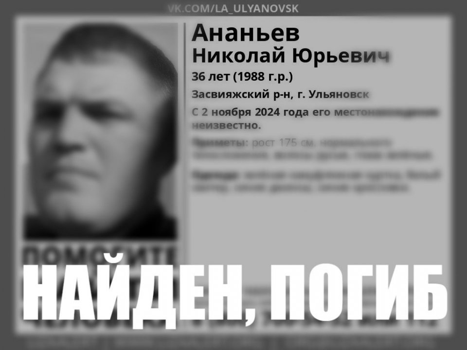 Напомним, 36-летний Николай Ананьев пропал в Засвияжском районе Ульяновска больше месяца назад, а именно 2 ноября 2024 года. Все это время его местонахождение оставалось неизвестным. Теперь же на ресурсах поисковиков появилось официальное сообщение: «Найден, погиб».