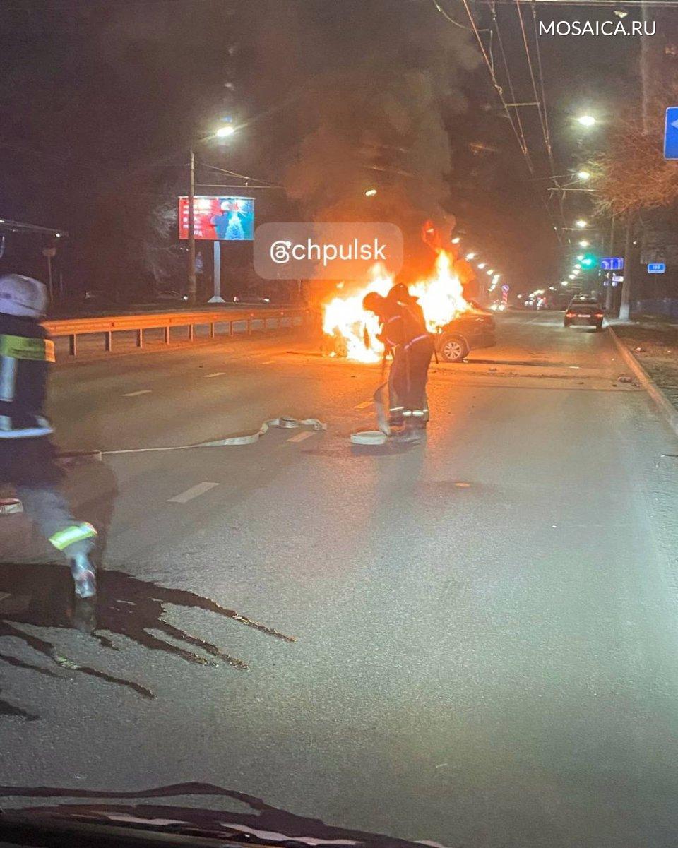 Как уточнили очевидцы, машина загорелась после ДТП, однако что именно случилось — пока не сообщается.
