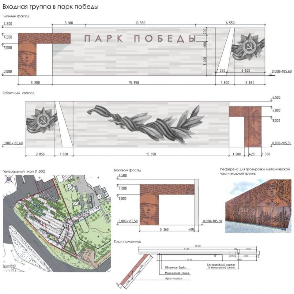 Итак, лучшей признали задумку с украшением входа в парк коваными элементами. Проект предлагает изобразить георгиевскую ленту с лавровым венком, а также образ солдата — он сложится из нанесённых оттиском фамилий и имён бойцов.