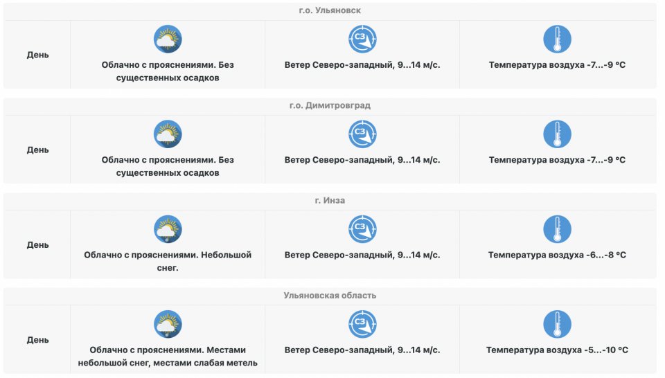 Что касается самого Ульяновска, то здесь температура воздуха будет немного ниже: от -7 до -9 градусов Цельсия. Ветер ожидается также северо-западный со скоростью 9-14 м/с. В целом, день будет облачным с прояснениями, однако существенных осадков не предвидится, что многих может порадовать. Аналогичная погода ожидается и в Димитровграде.