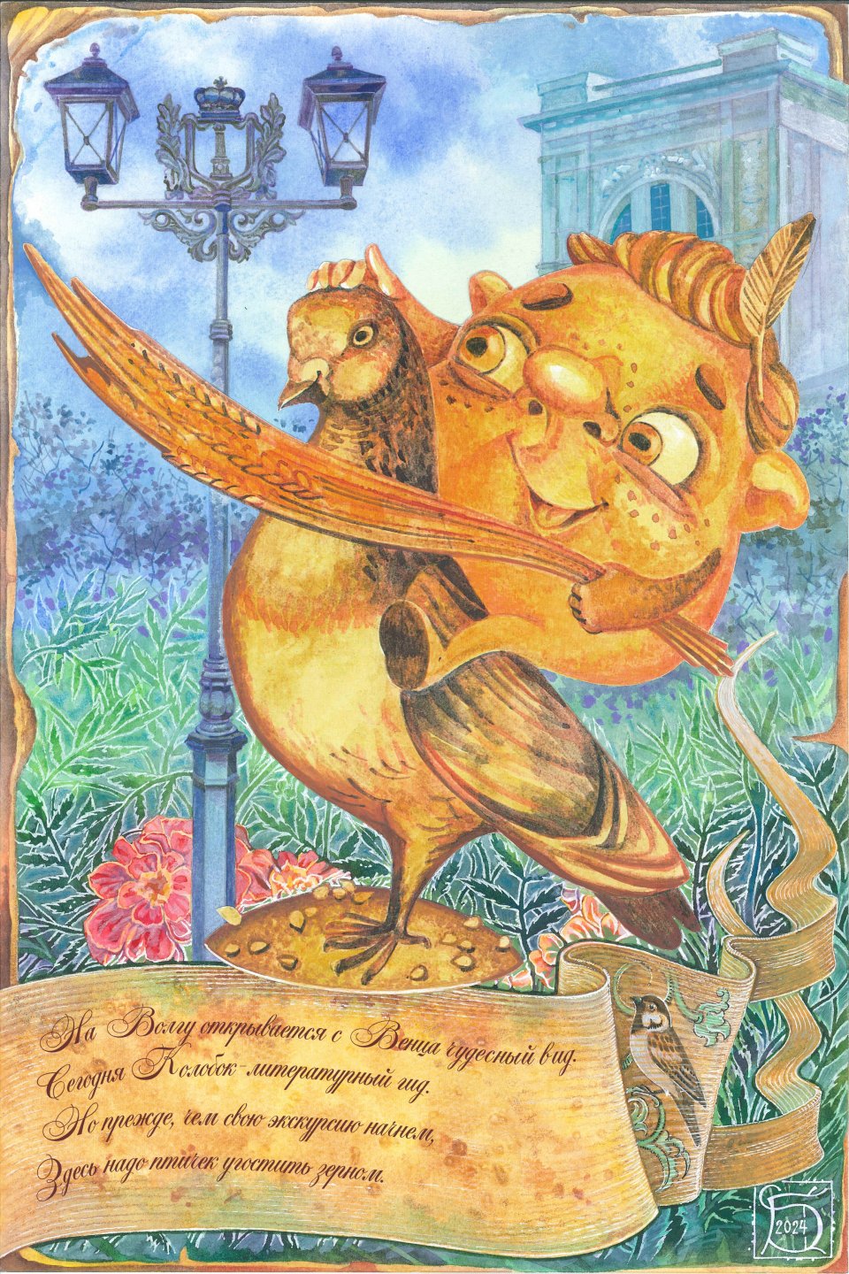 «Например, мне стало известно, что рядом с филармонией будет находиться первый Колобок, который рассказывает о происхождении слова «колебятко», — рассказывает художник. — Он указывает колосом в сторону Колобка-девочки. Девочка с аленьким цветочком держит в ладошке письмо от мальчика по имени «Д». Свободной ладошкой она проверяет, закончился ли дождь и одновременно указывает направление к следующему Колобку — Денису, который изображает гусара и указывает саблей на фигурку рядом с краеведческим музеем. Там находится Колобок с собачкой Мимишкой, которая смотрит в сторону скульптуры, стоящей рядом с памятником Карамзину. Колобок с Карамзиным указывает трубой, в которую трубит славу нашим историографам, на фигурку у Литературного музея «Дом Языковых». Следующий Колобок, Языков, указывает пером на Колобка Садовникова. А у Садовникова общее направление лодки — челна, в которой он сидит — и скрытой буквы, обозначающей как фамилию «Садовников», так и Стеньку Разина, в которой прячется стрела — всё это указывает на восьмого Колобка — ЮНЕСКО».