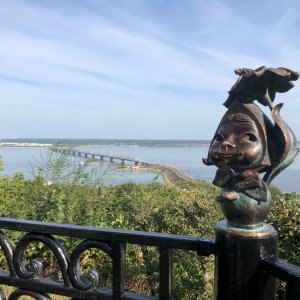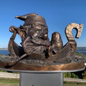 Колобок, олицетворяющий Степана Разина, стоит у парапета недалеко от памятника основателю Симбирска. Чтобы привлечь удачу, трите ему шапку!