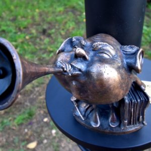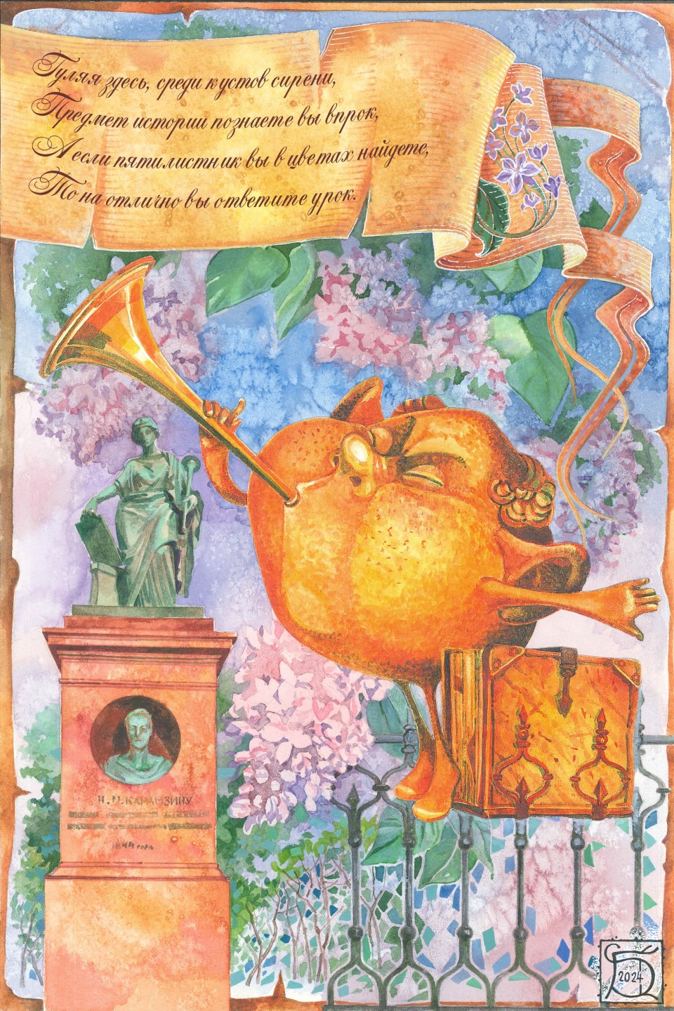 В Карамзинском сквере покровитель экскурсоводов и историков трубит в медную трубу. Если счастливый пятилистник не удастся найти в самом сквере, можно для удачи потереть изображение цветочка на фолианте, который Колобок держит в руке.