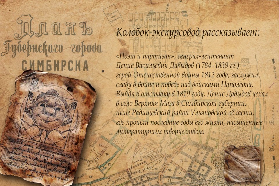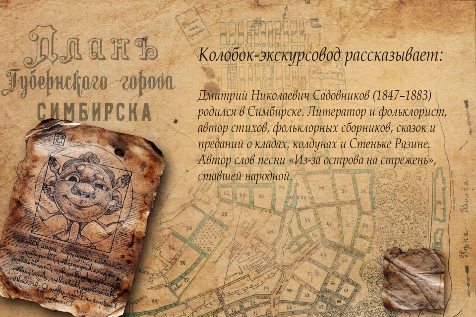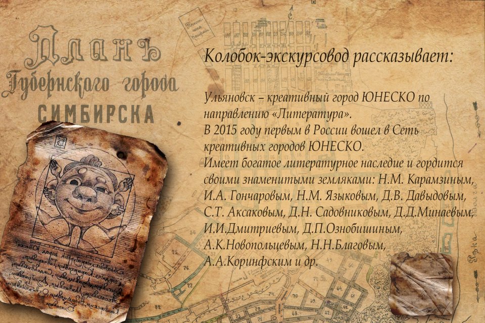 «Ульяновск первым в России в 2015 году вошел в Сеть креативных городов ЮНЕСКО. Город выбрал направление «Литература». В основе заявки — литературные традиции и богатое культурное наследие Симбирска 19-го века. Город славится литераторами – Иван Гончаров, Николай Карамзин, Николай Языков, Денис Давыдов, Сергей Аксаков, Дмитрий Садовников и другие. Удивительная история Симбирска-Ульяновска связана с их жизнью и творчеством. Поэтому возникла идея через литературные образы рассказать и об известных писателях нашего края, и об истории самого Симбирска-Ульяновска. Экскурсоводом по маршруту и выступил литературный сказочный герой — Колобок. Ведь Ульяновск считается его родиной!»