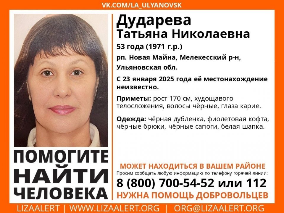 Как сообщают добровольцы, женщина 1971 года рождения пропала в рабочем поселке Новая Майна Мелекесского района. Ее местонахождение неизвестно с 23 января 2025 года.