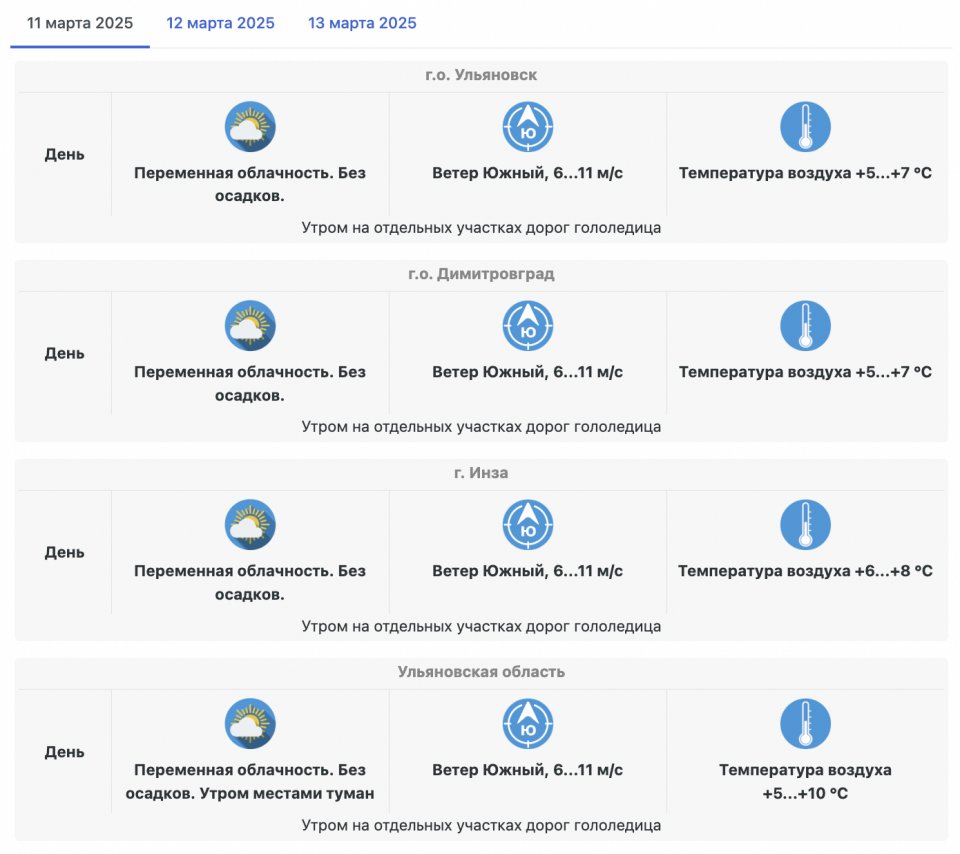 В течение дня ожидается переменная облачность. Ветер будет дуть южный, со скоростью 6-11 метров в секунду. Температура воздуха по области составит +5…+10 градусов. В Ульяновске и Димитровграде обещают от +5 до +7 градусов, а в Инзе — от +5 до +8 градусов.