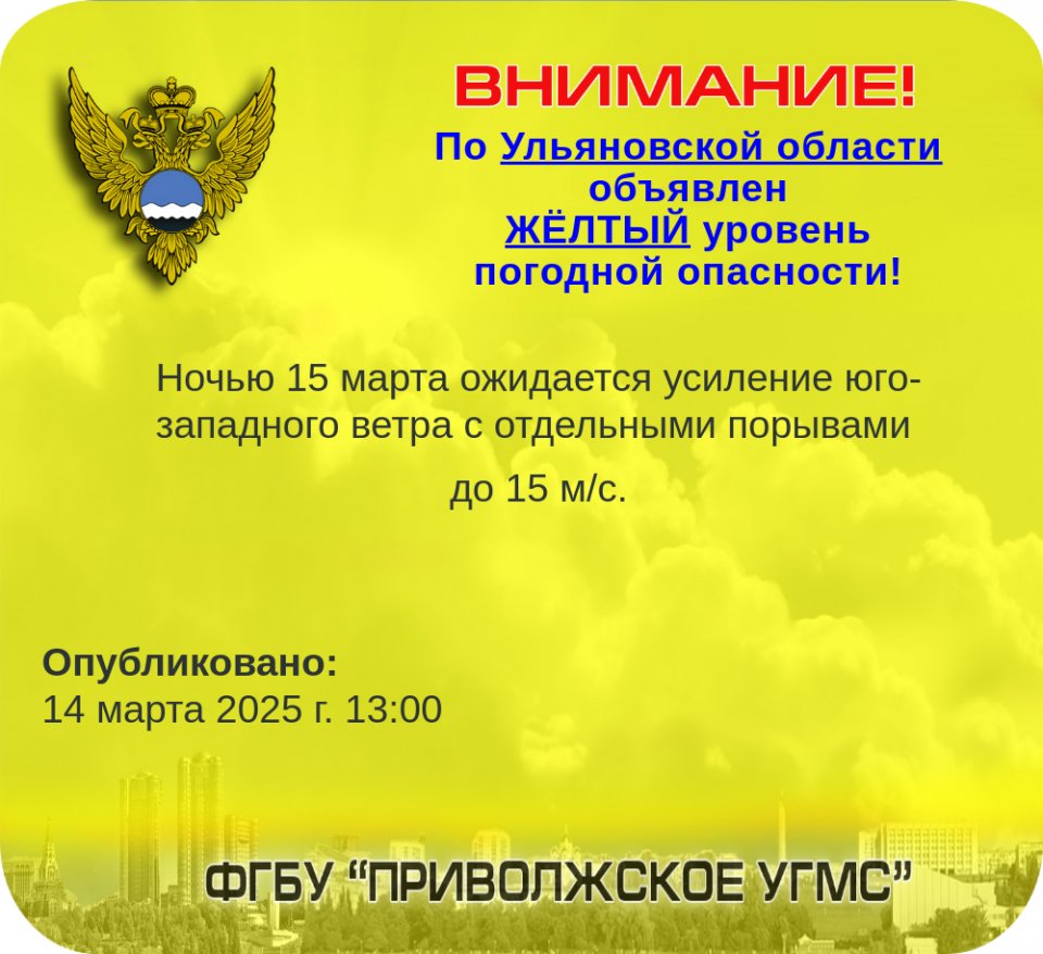 Приволжское УГМС предупреждает жителей Ульяновской области о неблагоприятных погодных условиях. На территории региона объявлен «желтый» уровень погодной опасности.
