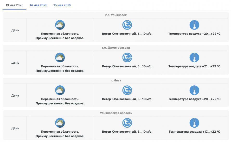 Непосредственно во вторник, 13 мая, воздух по области прогреется до +17...+22 градусов. В Ульяновске и в Инзе прогнозируют +20...+22 градусов, в Димитровграде — от +21 до +23 градусов. В небе ожидается переменная облачность, а скорость юго-восточного ветра составит 5-10 метров в секунду.