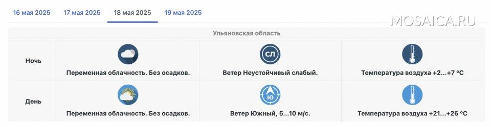 В предстоящие выходные, 17 и 18 мая, территория Ульяновской области будет находиться под влиянием антициклона. Ожидается устойчивый характер погоды.