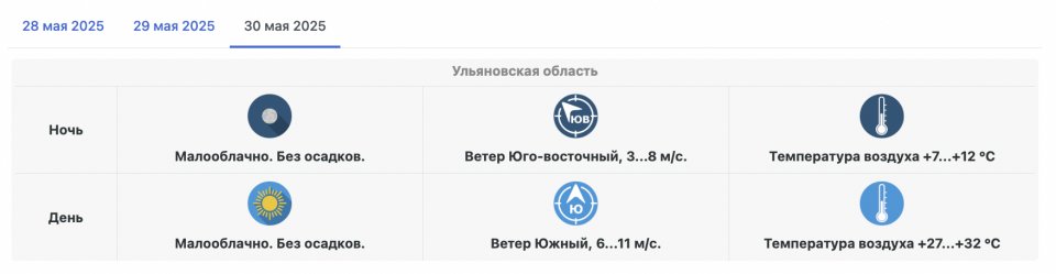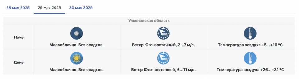 По словам специалистов, в последние дни весны 2025 года теплую погоду с отсутствием осадков в регионе обеспечивает установившийся над ЕТР обширный антициклон. Сегодня, например, ульяновцев ждет малооблачная погода с максимальным прогревом воздуха до +29 градусов.