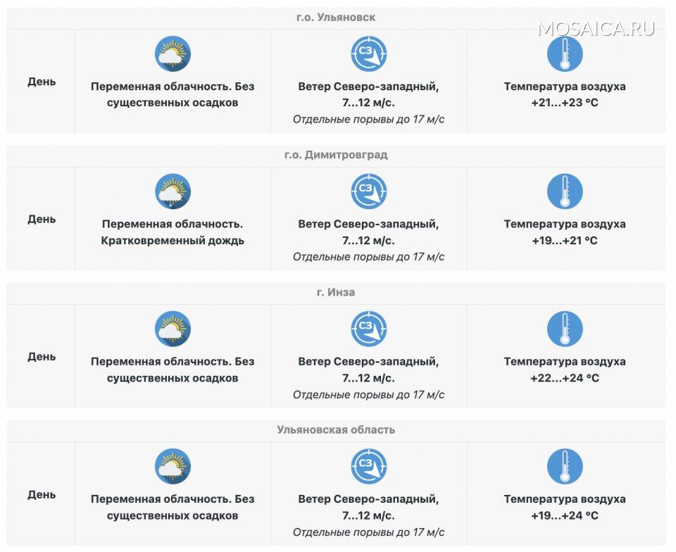 Температура воздуха по области составит +19…+24 градуса. В Ульяновске столбики термометров покажут от +21…+23 градусов, в Инзе — от +22 до +24 градусов. В Димитровграде будет чуть прохладнее — воздух прогреется лишь до +19…+21 градуса.