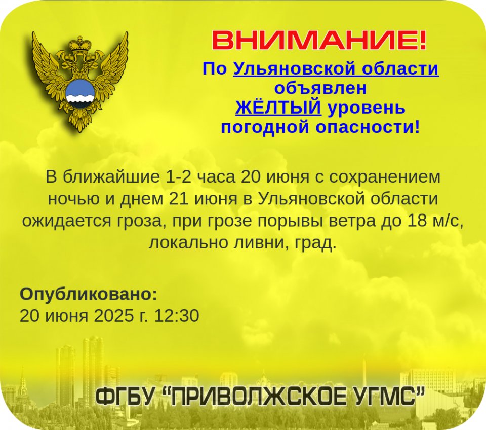 Как сообщили в региональном МЧС, ссылаясь на прогноз погоды от Ульяновского центра по гидрометеорологии и мониторингу окружающей среды, в ближайшие 1-2 часа 20 июня в Ульяновской области ожидается гроза. В то же время усилится ветер — отдельные его порывы будут достигать до 18 метров в секунду. Локально прогнозируют ливни и град.