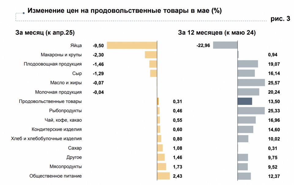 В мае сильнее всего выросли цены на услуги, особенно в общепите (+12,37% за год) из-за увеличения затрат на продукты, аренду и зарплаты. Среди товаров заметно подорожали мясные продукты (+9,52% за год) из-за роста логистических и трудовых издержек. Моющие средства (+5,55%), печатные издания (+7,91%), галантерея (+2,88%) и косметика (+7,51%) также показали рост цен за год.