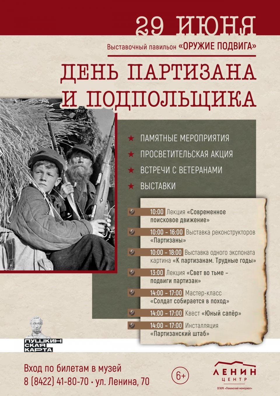 В 10:00 всех желающих приглашают на лекцию о современном поисковом движении. В 13:00 гости музея узнают о подвигах партизан на лекции «Свет во тьме — подвиги партизан». Затем они смогут встретиться с последним партизаном Ульяновска, Александром Афанасьевичем Козинцевым.