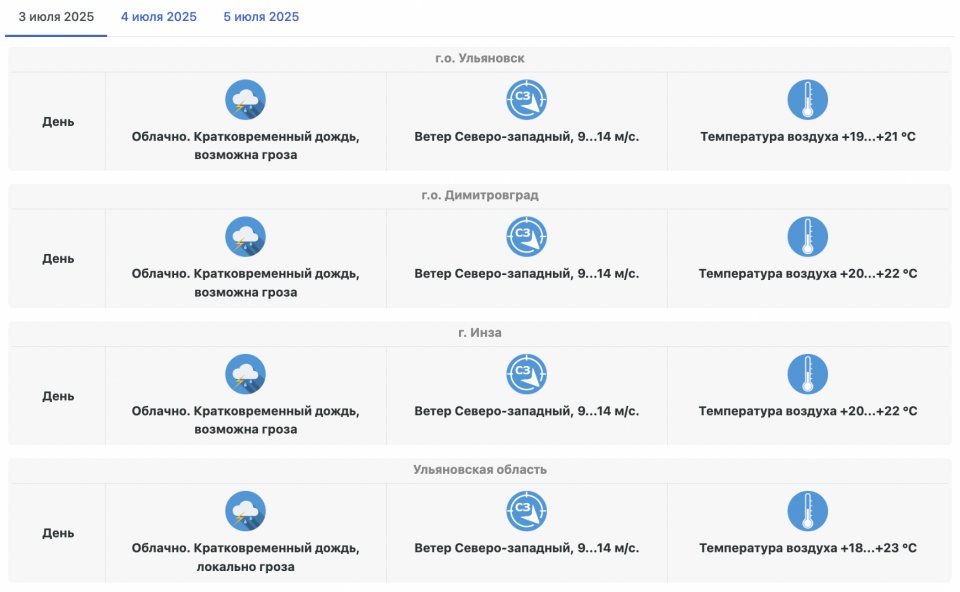 В четверг, 3 июля 2025 года, жителей Ульяновской области ожидает неустойчивая погода. По данным синоптиков, в регионе будет облачно, местами пройдут кратковременные дожди. В отдельных районах не исключены грозы.