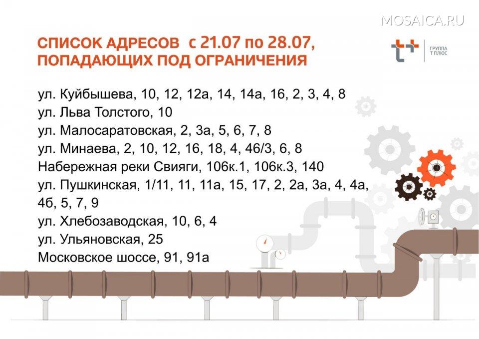 С 21 по 28 июля в Ульяновске приостановят подачу горячей воды по ряду адресов. Это связано с проведением работ на тепловых сетях. В указанные дни специалисты ПАО «Т Плюс» проведут гидравлические испытания трубопроводов.