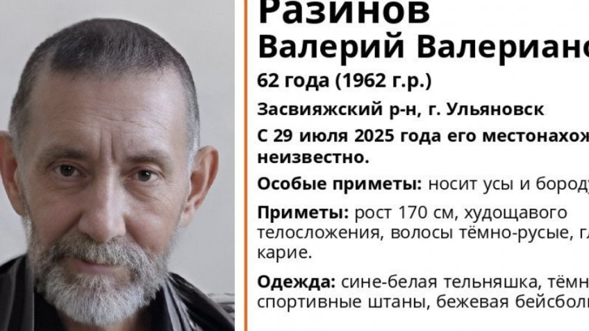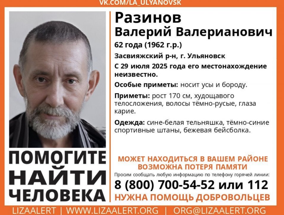 В Ульяновске волонтеры из поискового отряда «Лиза Алерт» начали поиски 62-летнего Валерия Валериановича Разинова. Мужчина исчез 29 июля 2025 года в Засвияжском районе, и с тех пор его местоположение остается неизвестным.