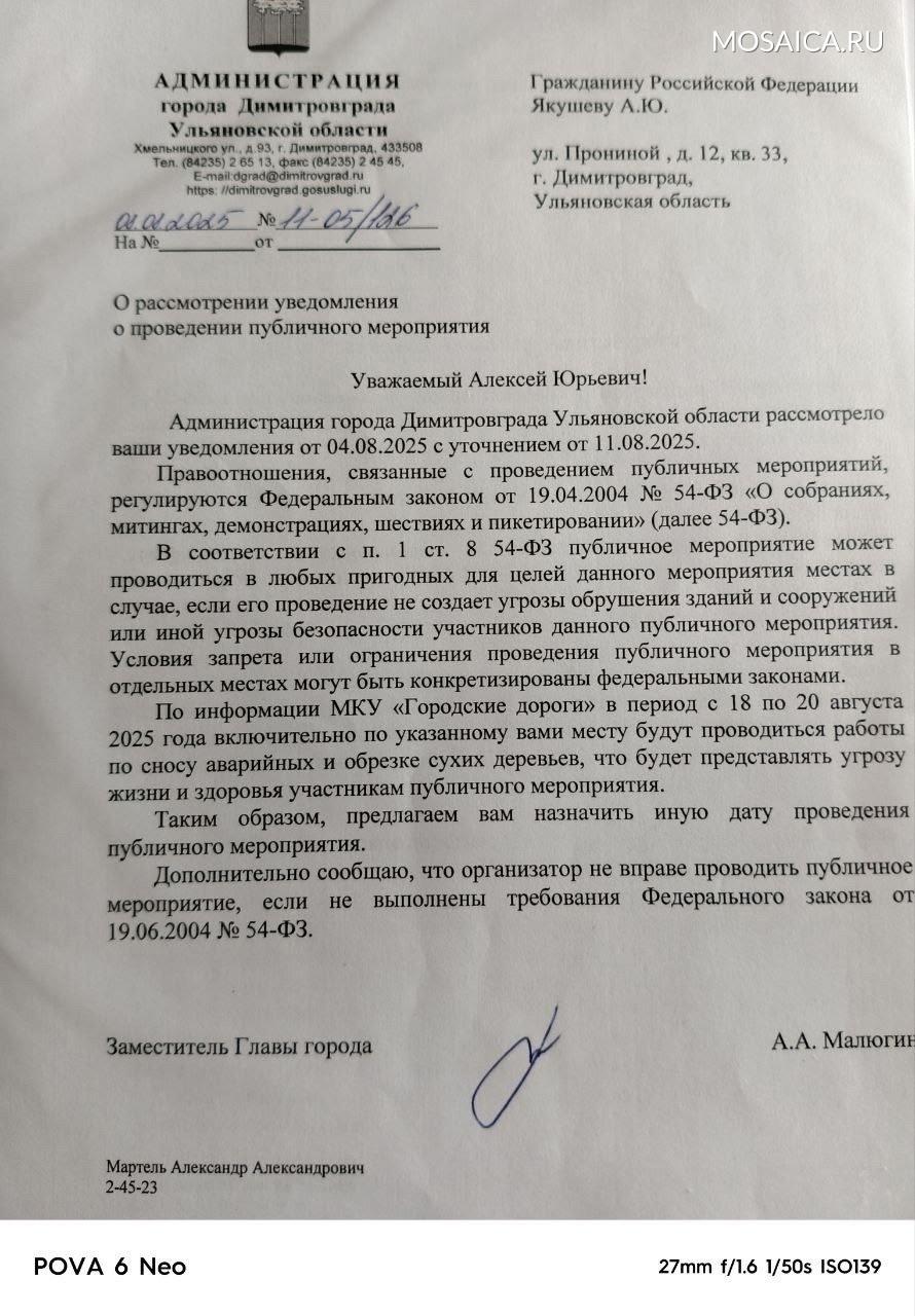 — Мы подали два заявления — на 18 и 19 августа, с разными формулировками, — поясняет Якушев. — Нам сразу начали возражать: якобы у меня есть неоплаченный штраф за пикет 2021 года, а в заявлении не указан врач (хотя это необязательно). Мы предоставили справку от приставов об отсутствии долгов, написали пояснение и назначили ответственного за медпомощь.