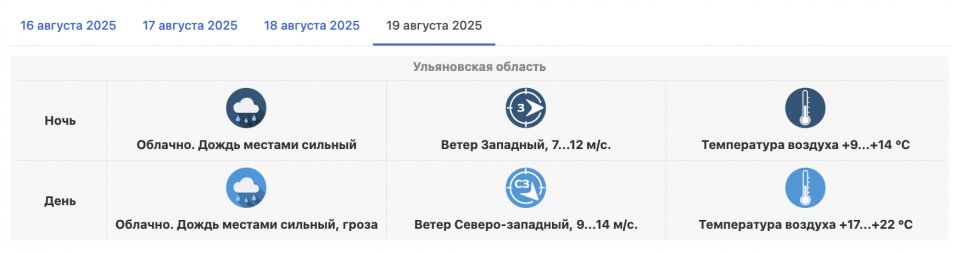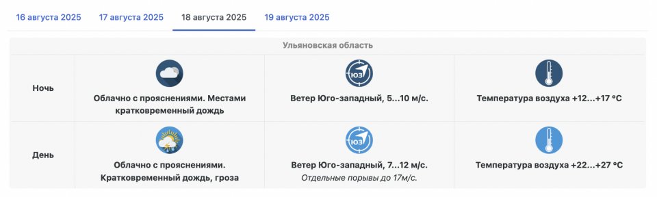Выходные 16 и 17 августа порадуют ульяновцев комфортно й теплой погодой без осадков. По словам синоптиков Приволжского УГМС, регион будет пребывать в поле повышенного атмосферного давления, и температурный режим приблизится к августовской норме. Так, например, днем 16 августа воздух прогреется до +26 градусов, днем 17 августа — до +28 градусов.