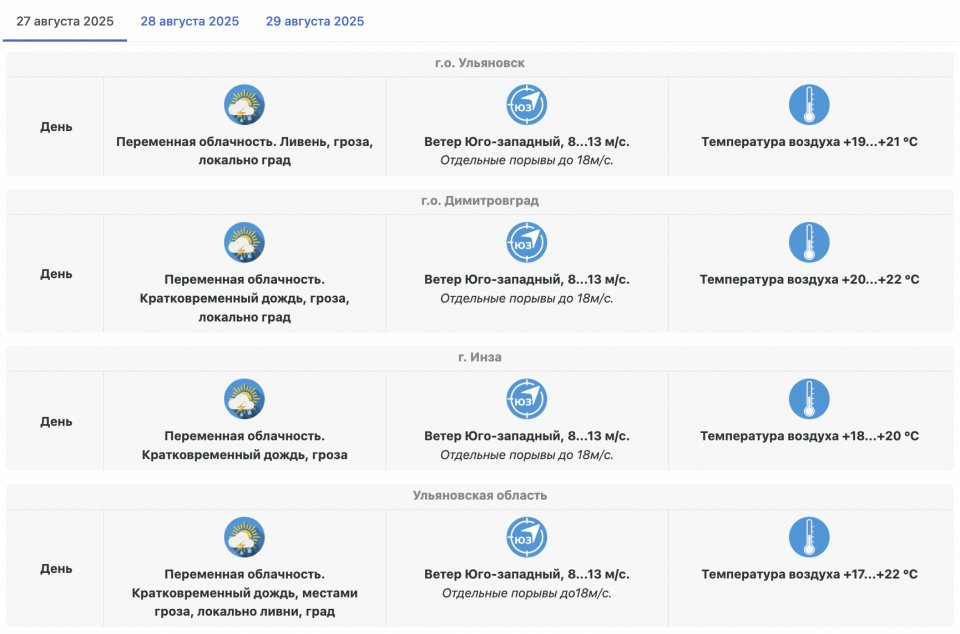 В среду, 27 августа, на Ульяновскую область обрушится очередной удар стихии. Об этом свидетельствует официальный прогноз погоды, опубликованный специалистами ФГБУ «Приволжское УГМС».