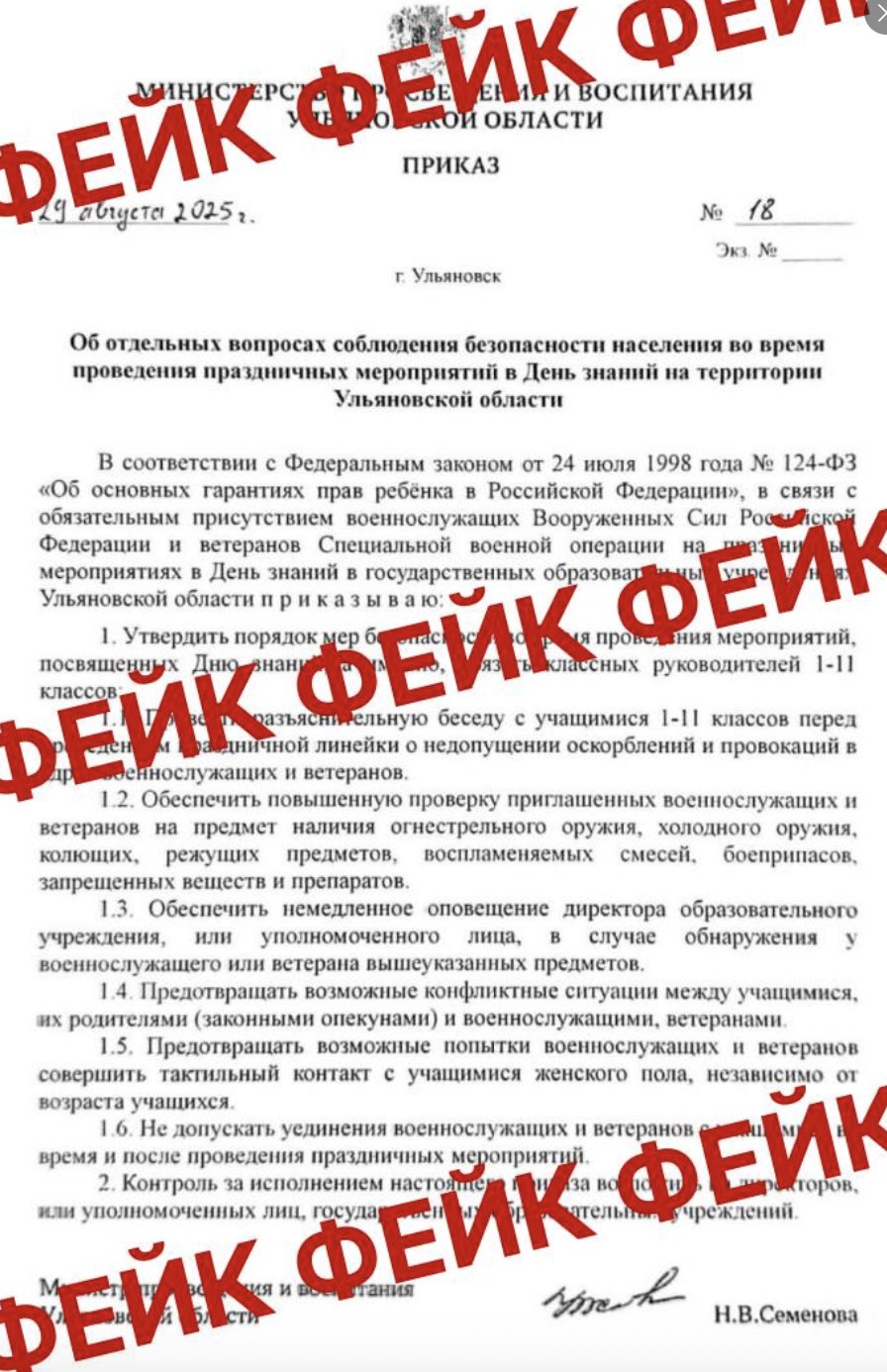 В сети появился поддельный документ под названием «Об отдельных вопросах соблюдения безопасности населения во время проведения праздничных мероприятий в День знаний на территории Ульяновской области». В нём утверждалось, что на школьных линейках 1 сентября обязательно должны присутствовать военнослужащие и ветераны СВО.