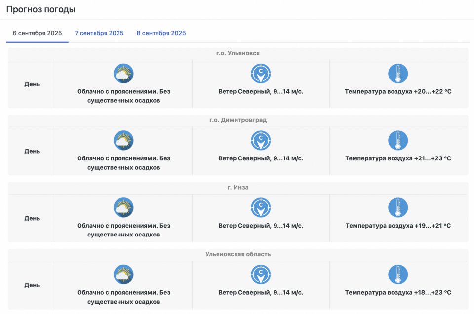Итак, в субботу, 6 сентября, будет облачно с прояснениями, без существенных осадков. По области ожидается до +18…+23 градусов при северном ветре 9-14 метров в секунду. В Ульяновске воздух прогреется до +20...+22 градусов, в Димитровграде до +21…+23 градусов, а в Инзе обещают до +19…+21.