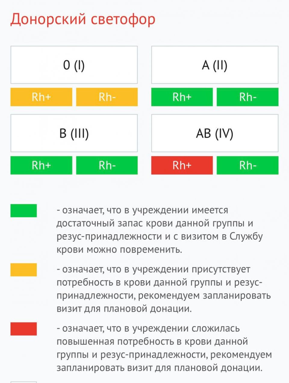 Служба крови опубликовала обновлённые данные донорского «светофора» — в регионе зафиксирована высокая потребность в цельной крови четвёртой группы (AB IV+) с положительным резус-фактором.