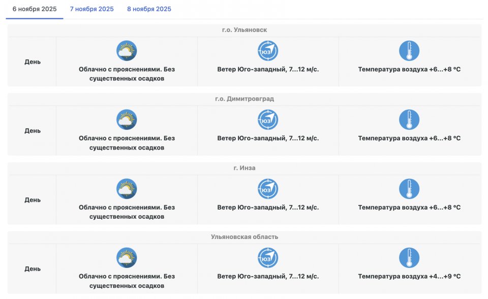 Днём в большинстве районов будет преимущественно без осадков, юго-западный ветер усилится до 12 м/с, а температура поднимется до +4…+9 градусов. В Ульяновске обещают до +6…+8 градусов. Такие же показатели ожидаются в Димитровграде и в Инзе.