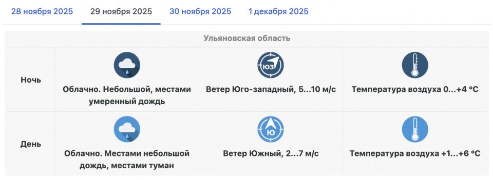 В Ульяновской области сохраняется неустойчивая погода: в субботу пройдут дожди разной интенсивности, а вот к воскресенью и 1 декабря атмосферная ситуация стабилизируется — осадки почти прекратятся, но из-за высокой влажности местами ожидаются туман и гололедица. Такой прогноз дают в Приволжском УГМС.