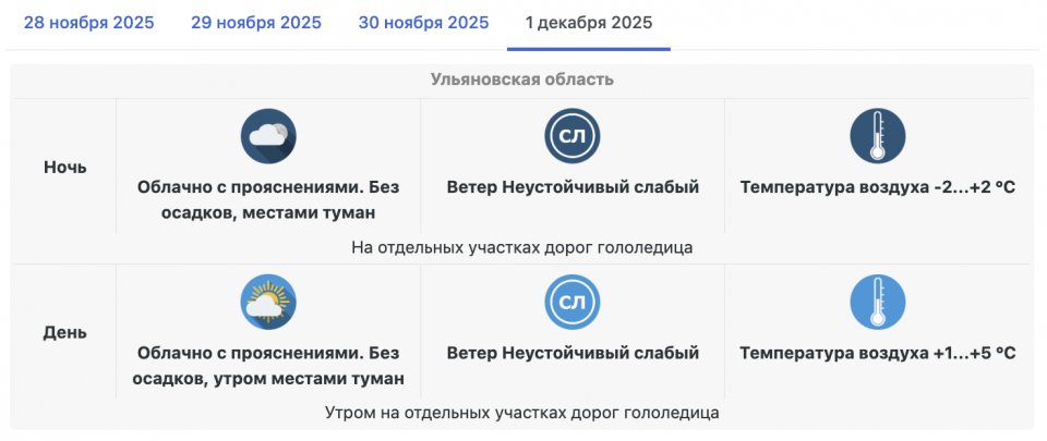 1 декабря, в первый день календарной зимы, характер погоды почти не изменится: ночью облачно с прояснениями, без осадков, местами туман и гололедица. Температура — −2…+2 градуса при слабом неустойчивом ветре. Днём обойдётся без осадков, утром местами ожидается туман, воздух прогреется до +1…+5 градусов. На дорогах местами сохранится гололедица.