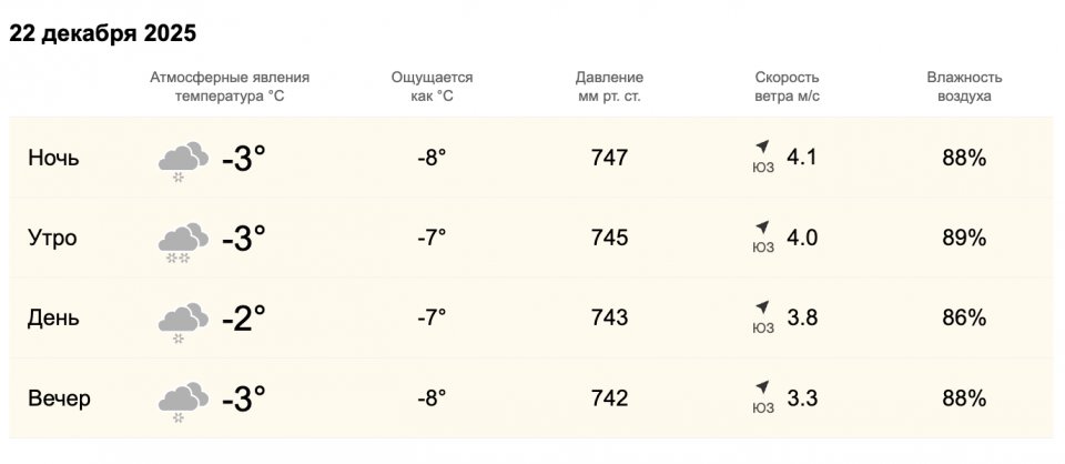 Ночь: −3°С, ощущается как −8°С