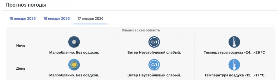 Днем морозы немного ослабнут, однако тепла ждать не стоит. В светлое время суток температура по Ульяновской области будет колебаться в пределах −12…−17 градусов. Осадков также не прогнозируется, сохранится малооблачная погода и слабый ветер.